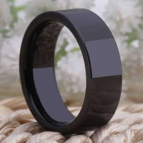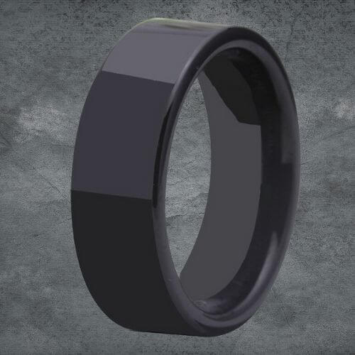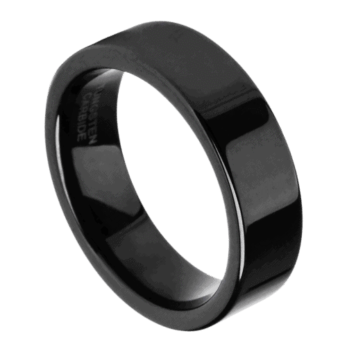 Une bague en tungstène élégante pour hommes. Un bracelet plat pour homme avec une finition noire polie et lisse. Tout simplement sublime.