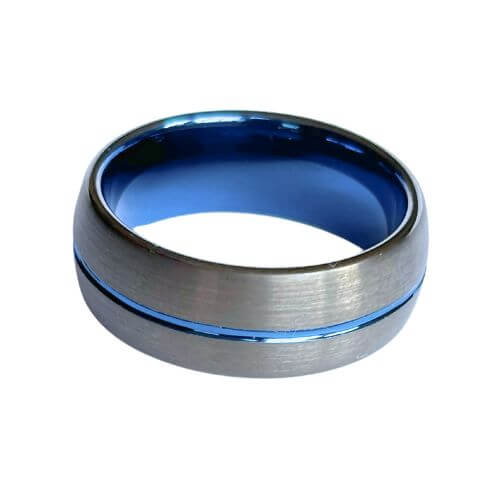 Une magnifique bague en tungstène gris gunmetal pour homme. Élégamment bombé avec une ligne de bleu poli vibrant traversant le centre de la bague et du bleu à l’intérieur.